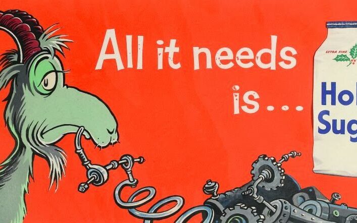 Seuss bu sınırdan yola çıkarak, hayal gücü yüksek, yaramaz ve unutulmaz bir karakter yarattı: kırmızı-beyaz çizgili şapkasıyla tuhaf bir kedi. Şapkalı Kedi, yağmurlu bir günde evde sıkılan iki çocuğun hayatına girip ortalığı karıştırırken aslında okuma sürecini keyifli hale getirdi. Kitap yalnızca birkaç yüz basit kelimeyle yazılmış olmasına rağmen, ritmik kafiyeler ve tekrarlarla çocuklara dilin melodisini sevdirdi. Aşağıdaki slayt gösterisinde, Dr. Seuss’un farklı markalar için hazırladığı reklam çizimlerinden örnekleri görebilirsiniz.