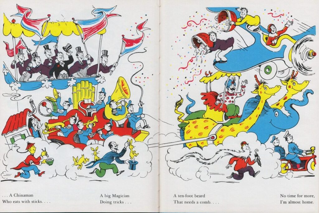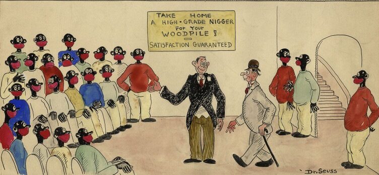 Benzer şekilde 1930’lu yıllarda Seuss’un reklam illüstrasyonlarında ve dergi kapaklarında Afrikalı ve Asyalı karakterler aşağılayıcı klişelerle betimlenmiştir. Örneğin If I Ran the Zoo kitabının çizimlerinde uzun saç örgülü, çıplak ayaklı ve hayvan taşıyan “egzotik” figürler kullanmış; bu figürler Afrika kökenlileri ilkel ve insandan çok hayvana yakın bir şekilde resmetmiştir. Yine And to Think That I Saw It on Mulberry Street kitabında “Çinli” karakter, konik şapkası, sarı teni ve çubukla yemek yiyen karikatürize bir figür olarak tasarlanmıştı. O yıllarda sıradan görülen bu görseller, günümüz çocuk edebiyatı standartlarıyla kıyaslandığında aşağılayıcı ve sorunlu kabul edilmektedir.